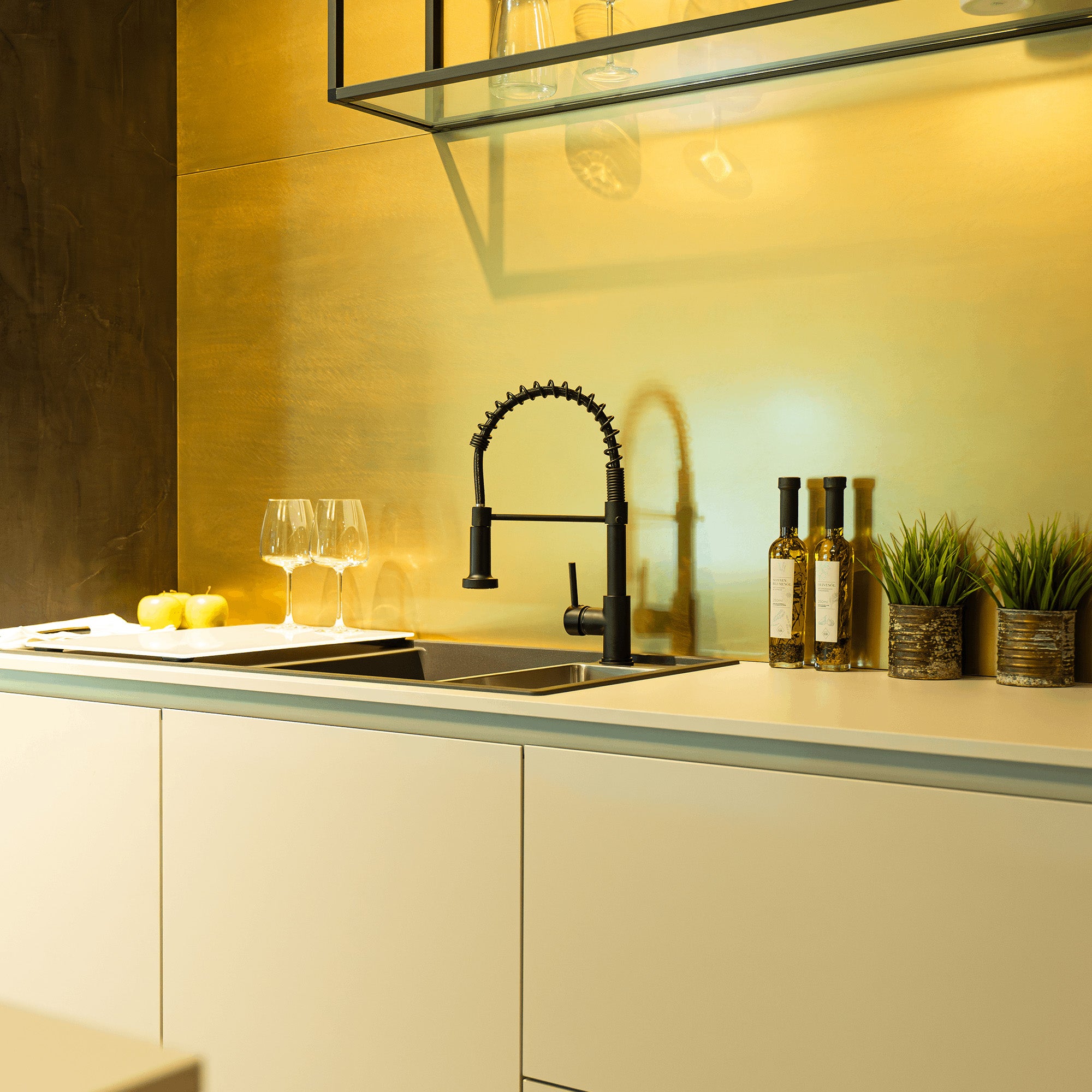 Il rubinetto da cucina Sylt 100 di Rosenhahn & Söhne combina durata e design moderno. È dotato di un'area girevole che consente di raggiungere facilmente qualsiasi punto all'interno e all'esterno del lavello. Inoltre, può essere utilizzato da entrambi i lati e può essere ruotato per guadagnare spazio! L'elegante design nero opaco e la finitura in ottone di alta qualità rendono il nostro rubinetto per lavello un vero e proprio richiamo visivo. Questo rubinetto è inoltre dotato di una lega che lo protegge dal calcare e dalla ruggine. Viene fornito con una guida dettagliata e illustrata per aiutarvi a installarlo con facilità.
