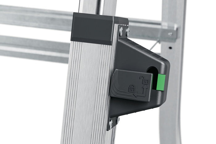Alluminio - scala a gradini telescopica per altezze di lavoro flessibili - gradini di salita e di appoggio regolabili su 3, 4 o 5 gradini - combinazione gradino/piolo - utilizzabile su scale, regolazione max. del gradino 440 mm - piattaforma di appoggio extra-large L 299 x P 275 mm - vassoio di stoccaggio con aree di stoccaggio per lattine (di vernice) di dimensioni diverse - risparmio di spazio - carico totale max. 150 kg