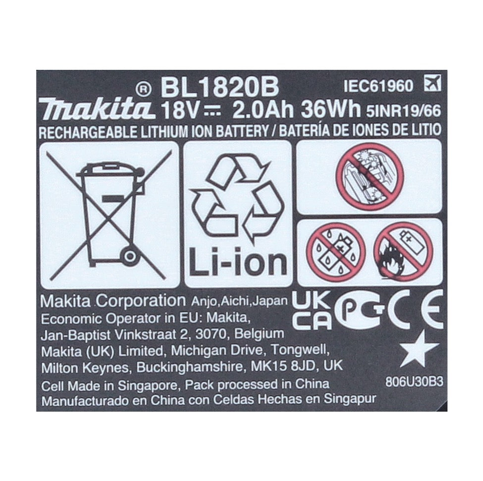 Set di batterie ricaricabili Makita 18 V con 2 batterie BL 1820 B da 2,0 Ah ( 2x 197254-9 )