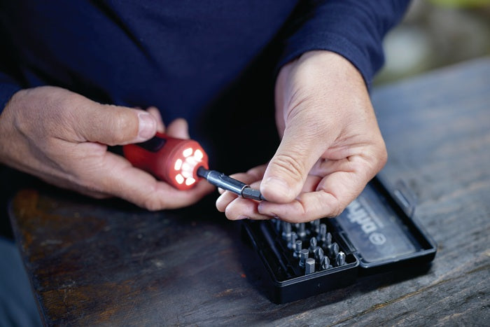 - Impugnatura del cacciavite speedE® PocketDrive, scatola di 31 pezzi con punte a taglio, Phillips, Pozidriv, esagonali, TORX®, portapunte magnetico, cavo di ricarica USB (tipo USB-C), softbox