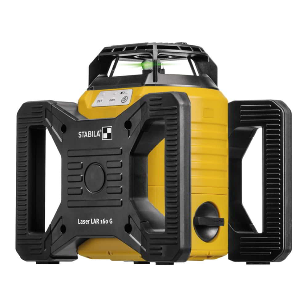 laser rotante completamente automatico e controllato dal motore - autolivellamento rapido in 20 secondi - tecnologia STABILA GREENBEAM per una migliore visibilità del raggio laser rotante - i raggi laser verdi sono 4 volte più visibili all'occhio umano rispetto ai raggi rossi - quattro funzioni laser per un uso versatile - rotazione orizzontale e verticale, rotazione orizzontale e verticale, funzione perpendicolare e angolo retto (90°) in modalità verticale - resistente alla polvere e all'acqua - il coperchio STABILA Softgrip ad assorbimento d'urto protegge dagli urti - le ottiche del laser sono inoltre protette dalla robusta testa dell'alloggiamento - funzionamento semplice tramite tre pulsanti di controllo - On/Off, modalità di inclinazione, modalità manuale - cassetto per le batterie - facile da sostituire, anche direttamente sul treppiede - ampio raggio d'azione con ricevitore REC 160 RG - fino a 600 m di diametro - due filettature da 5/8" integrate nell'alloggiamento - piastra di puntamento con supporto magnetico e mirino - campi di applicazione: lavori di progettazione, posa di pareti divisorie e sospensione di soffitti, lavori di installazione elettrica - allineamento orizzontale e verticale di prese, interruttori e canaline per cavi, lavori di installazione nell'edilizia industriale - misurazione dei livelli e determinazione degli allineamenti per la posa di cavi e tubi, montaggio industriale - misurazione e allineamento di sistemi di scaffalature nelle aree logistiche - attacco per treppiede 2 x 5/8″