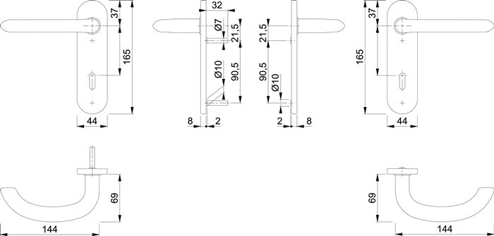 Set con placca corta per porte interne testato secondo DIN EN 1906 (categoria di utilizzo classe 3) · Maniglie per porte con collegamento a perno rapido (con perno pieno da 8 mm) per spessore porta 37 - 42 mm e molla di richiamo · Viti nascoste · Senso di battuta DIN sinistra / destra Distanza 72 mm