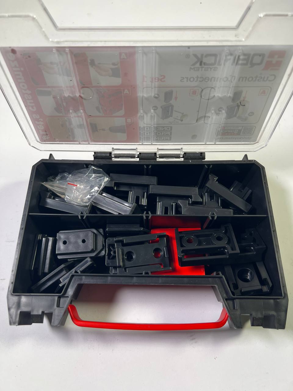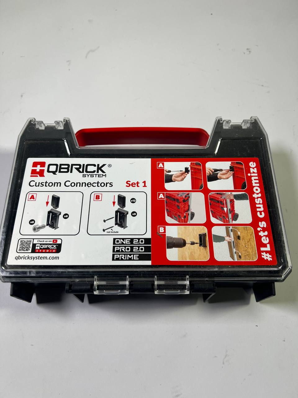 Con il set di connettori personalizzati 1 di Qbrick System, potete modificare la vostra cassetta degli attrezzi come preferite! È sufficiente collegare gli zoccoli di connessione alla cassetta degli attrezzi e attaccare la controparte all'oggetto desiderato. Non ci sono limiti all'organizzazione dei vostri utensili!