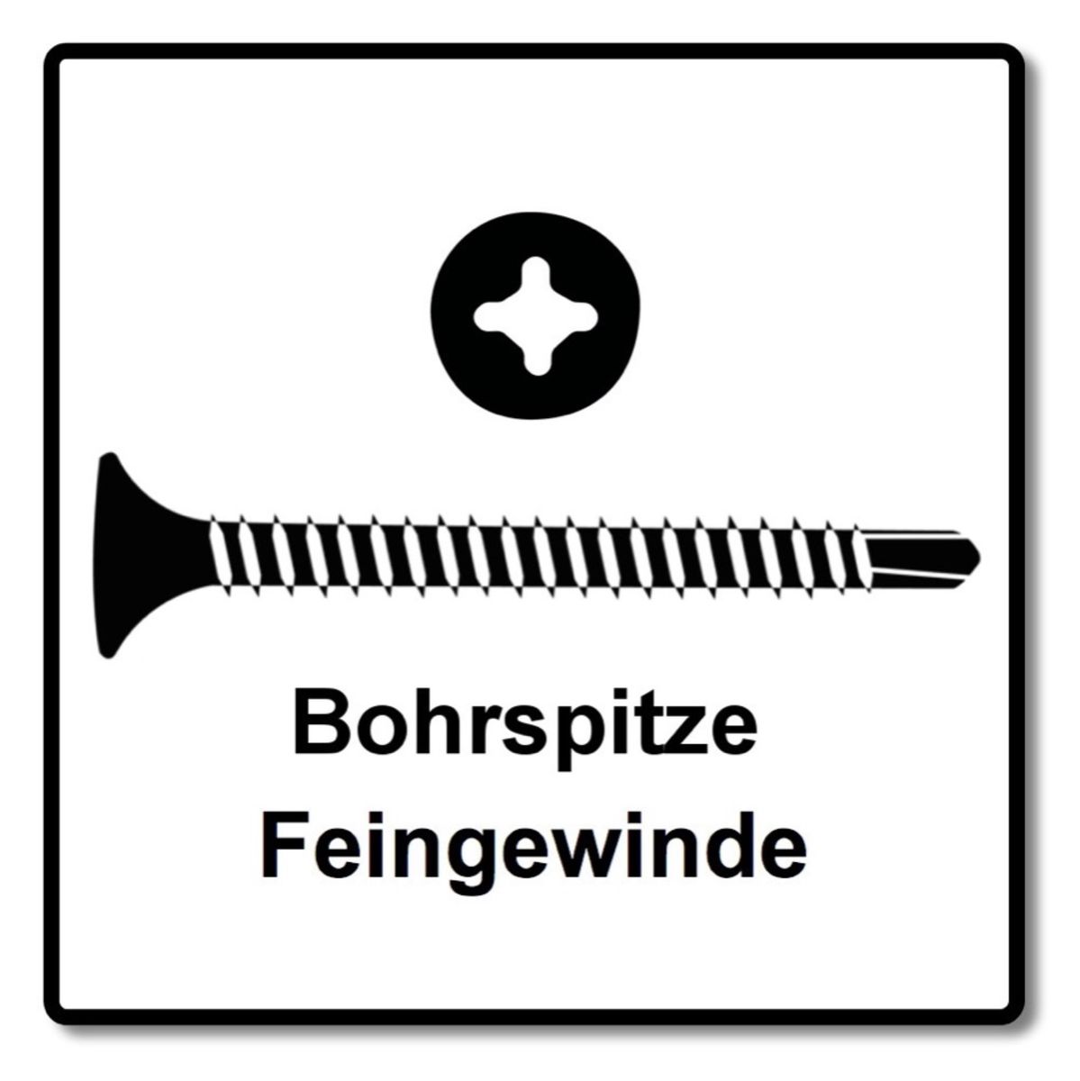 Die Schnellbauschrauben eignen sich zur Befestigung von Gipskarton auf Metallprofile bis 2,0 mm Stärke. Das Blechgewinde der Schrauben sorgt dabei für die schnelle Verschraubung und den sicheren Halt bei der Verschraubung in verstärkte Metallprofile. Das Vollgewinde ermöglicht die Aufnahme hoher Zugkräfte und einen höheren Anpressdruck beim Verschrauben. Der Trompetenkopf dient der Vermeidung der Zerstörung der Pappschicht und gibt der Platte einen sicheren Halt. Ein wesentlicher Vorteil des Kreuzschlitz H2 ist die optimierte Kraftübertragung zwischen Schraube und Werkzeug. Dadurch wird die Materialbeanspruchung vermindert und der Ansatz für die Kraftübertragung erhöht. Durch die zwei kleinen Schneiden der Bohrspitze eignen sich die Schrauben vor allem in der Verwendung zur Befestigung von und in Metallen. Die auffällige schwarze Färbung ist Folge einer Phosphatierung, ein Korrosionsschutz, der dafür sorgt, dass die Schrauben gegen Feuchtigkeit resistent sind. Die Schnellbauschrauben sichern immer den perfekten Halt der Platten auf dem Ständerwerk und lassen sich millimetergenau versenken.