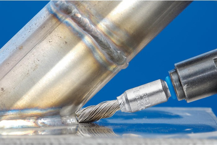spazzola flessibile a nodo singolo con corpo spazzola rivestito in plastica - ottima resistenza alla corrosione e durata ottimale - trim blu INOX per l'uso su tutti gli acciai inossidabili (INOX) - come il V4A. Il filo di acciaio inossidabile (INOX) resiste a temperature fino a 450 °C - Albero Ø 6 mm