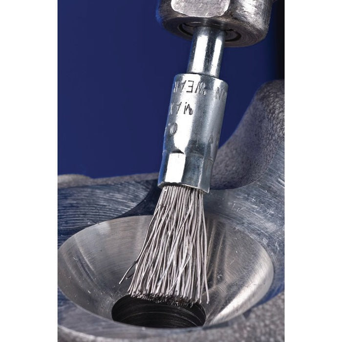 per lavori di spazzolatura leggeri come sbavatura, pulitura e deragnatura - il materiale di riempimento del filo d'acciaio ha un'elevata resistenza alla fatica a trazione e a flessione - garantisce un'usura ottimale del filo e una lunga durata, anche in applicazioni di spazzolatura estreme. Il filo d'acciaio può resistere a temperature fino a 300 °C. Gambo Ø 6 mm
