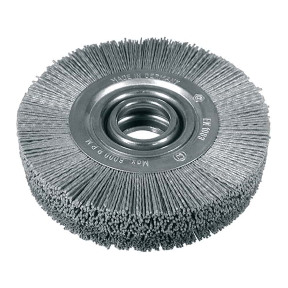 Spazzola tonda in nylon abrasivo con carburo di silicio per la finitura - per l'uso su lucidatrici e macchine CNC - foro Ø 31,75 mm - Vantaggi: effetto abrasivo uniforme, in quanto viene costantemente rilasciato nuovo materiale abrasivo man mano che il materiale di supporto si consuma elevata elasticità e flessibilità senza rischio di rottura nessun intasamento della superficie del filamento con residui di lavorazione adatto per lavori a secco e a umido, in quanto il nylon non assorbe quantità significative di refrigerante o lubrificante resistente ad acidi e alcali deboli nessun taglio del filamento necessario per il normale utilizzo lunga durata in condizioni ottimali velocità adeguata (22 m/sec) bassa pressione di contatto bassa generazione di calore campi di applicazione: Rimozione di ruggine leggera dalle carrozzerie di autoveicoli Sbavatura e levigatura fine di laminati, schede e circuiti stampati Sbavatura di bave di taglio e punzonatura Plastificazione, irruvidimento e opacizzazione Levigatura di legno e compensato