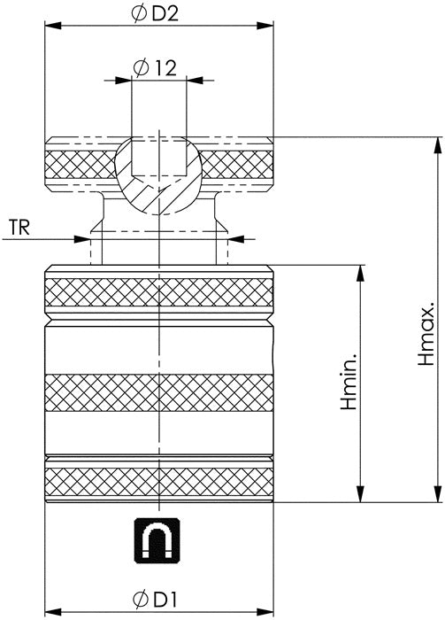 con supporto piatto e base magnetica - mandrino: filettatura trapezoidale, autobloccante, con fine corsa - acciaio temperato, verniciato - il magnete permanente può essere utilizzato per ottenere un posizionamento preciso del pezzo in posizione verticale - specifica Ø = senza base magnetica
