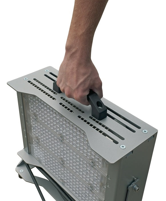 Faretto LED universale per montaggio su treppiede o a pavimento - Alloggiamento in alluminio, verniciato a polvere grigio argento - Staffa di supporto in acciaio, verniciata a polvere grigio argento con 4 piedini in gomma - Robusta maniglia di trasporto in plastica nera - Testa della luce regolabile finemente con incrementi di 6° - Coperchio in PC trasparente - Con ottica a lente - Supporto per raccordo DIN integrato secondo DIN 1464 - Dimensioni L. 446 x L.172 x H. 334 mm