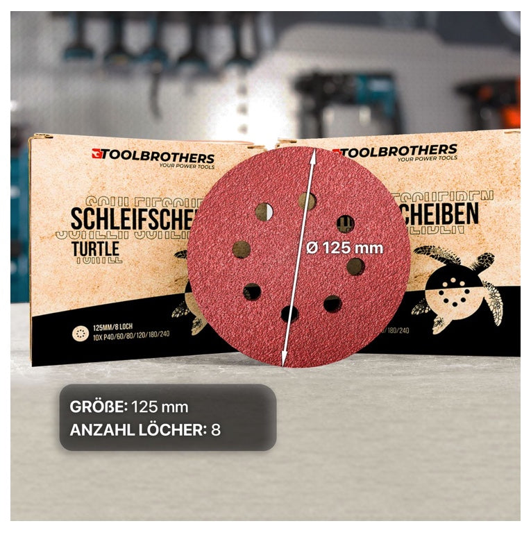 Toolbrothers TURTLE Set di levigatura 125 mm in velcro - 8 fori - 40x P40 / P60 / P80 / P120 / P180 / 240 - per legno duro, legno dolce, vernice, pietra, acciaio, alluminio, impiallacciatura.