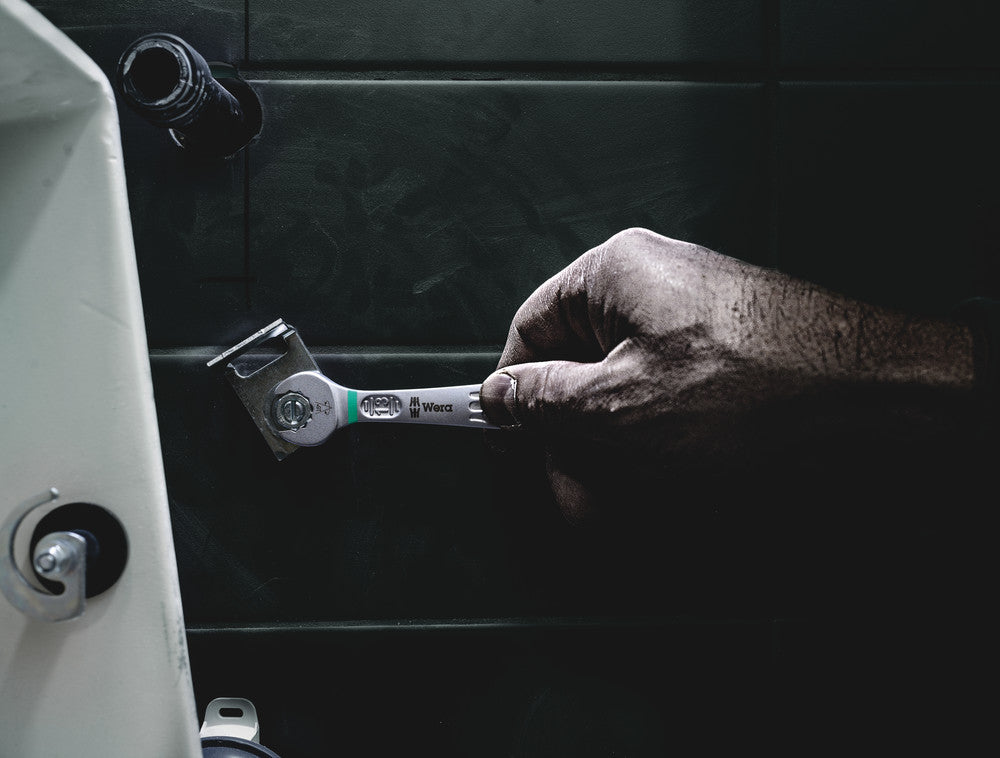 grazie all'angolo di ritorno di soli 15°, è adatto anche per spazi di montaggio particolarmente stretti - lato della ganascia orientabile di 7,5° - con sistema di codifica dei colori - la combinazione della ganascia orientabile di 7,5° e della geometria a doppio esagono raddoppia i punti di contatto - con una rotazione ripetuta di 180° della chiave intorno all'asse longitudinale, ci sono 4 punti di contatto e i dadi e i bulloni possono essere afferrati ogni 15°