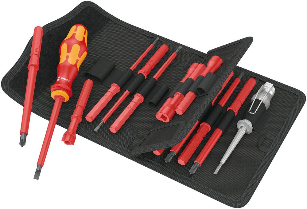 Inhalt: 1 isolierter Kraftform-Handgriff (98 mm) je 1 isolierte Wechselklinge für Schlitzschrauben 2,5 x 0,4 / 3,5 x 0,6 / 4,0 x 0,8 / 5,5 x 1,0 mm** je 1 isolierte Wechselklinge für Schrauben mit Kreuzschlitz (PH) Gr. 1 / 2** je 1 isolierte Wechselklinge für Schrauben mit Kreuzschlitz (PZD) Gr. 1 / 2** je 1 isolierte Wechselklinge für Plus-Minus-Schrauben (Schlitz/PH) Gr. 1 / 2** je 1 isolierte Wechselklinge für Plus-Minus-Schrauben (Schlitz/PZD) Gr. 1 / 2** je 1 isolierte Wechselklinge mit Innenvierkant 6,3 / 8,1 mm* 1 isolierte Wechselklinge mit Innendreikant* 1 isolierte Wechselklinge mit Doppelbart* 1 Spannungsprüfer 3,0 x 70 mm * 89 mm lang ** 154 mm lang Lieferung in Falttasche – kann am Gürtel befestigt werden