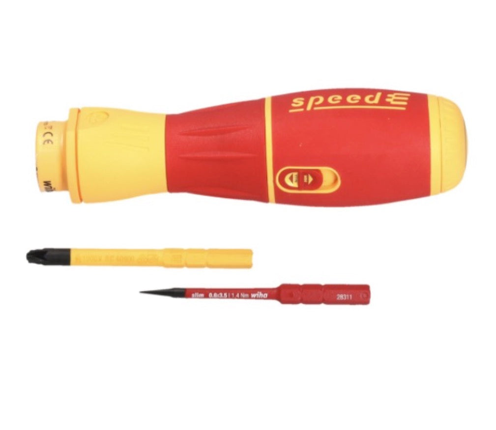 Der Wiha speedE II steigert Ihre Arbeitsgeschwindigkeit um das dreifache. Der qualitativ hochwertige elektro Schraubendreher ist für jeden Handwerker eine immense Arbeitserleichterung. Die gesundheitlichen Folgen der manuellen Verschraubung sind unter anderen: Schmerzen im Handgelenk, Entzündungen der Sehnen und vieles mehr. Mit dem speedE II ist die Möglichkeit geschaffen diese effektiv zu minimieren. Die Kombination aus Arbeitserleichterung und der ergonomische Handgriff konnte Ärzte und Therapeuten des AGR überzeugen. Die ausgeklügelte Technik im Kern des Schraubers ist bestens für sensible Verschraubungen geeignet. So gewährleistet die integrierte Materialschutzfunktion eine Abschaltung bei 0,4 Nm, der Anwender kann bei Bedarf die letzten Millimeter gefühlvoll von Hand nachziehen. Darüber hinaus besitzt der speedE selbstverständlich auch einen Schiebeschalter der eine Verschraubung von 1 Nm zulässt, somit sind auch kraftvollere Schraubarbeiten möglich. Und wenn das alles nicht reicht, kann man selbstverständlich manuelle Verschraubungen bis zu 12 Nm bewerkstelligen ohne den Schraubendreher zu beschädigen. Für eine schlecht beleuchtete Arbeitsumgebung ist der speedE auch ausgelegt, er besitzt eine integrierte LED Leuchte die einem immer bestmögliche Lichtverhältnisse spendet. Des Weiteren sticht die noch bessere Bedienfreundlichkeit, der große Ringschalter sowie der sehr gute Rundlauf hervor. Wie man sieht ist die Kombination aus anstrengender Arbeit unter Berücksichtigung der Erhaltung der Gesundheit möglich. Ob Steckdosenmontage, Arbeiten am Schaltschrank, Industriearbeiten, allgemeine Motorarbeiten, im Bereich der Klima- und Sanitärinstallationen oder im Hausgebrauch, der speedE II ist eine große Arbeitserleichterung für jeden Anwender. Die mitgelieferten isolierten slimBits eignen sich ideal für elektrische Anwendungen. Dank der slimTechnology sind auch tiefliegenede Schraub- und Federelemente problemlos erreichbar. Ermöglicht wird dies durch die Schutzisolation, die im vorderen Bereich des Bits integriert ist. Die slimBits können ein sicheres Arbeiten an unter Spannung stehenden Teilen bis zu 1000 V AC gewährleisten. Die slimBits sind bicht nur mit diesem Schraubendreher, sondern auch mit allen anderen slimVario Werkezeugen kompatibel. Sie eignen sich nicht für den Maschinenbetrieb. Das 6-teilige slimBit Set steigert die Effizienz, da es eine enorme Platzeinsparung durch das umfangreiche Wechselklingensystem gibt. Die Bits sind zudem VDE geprüft.